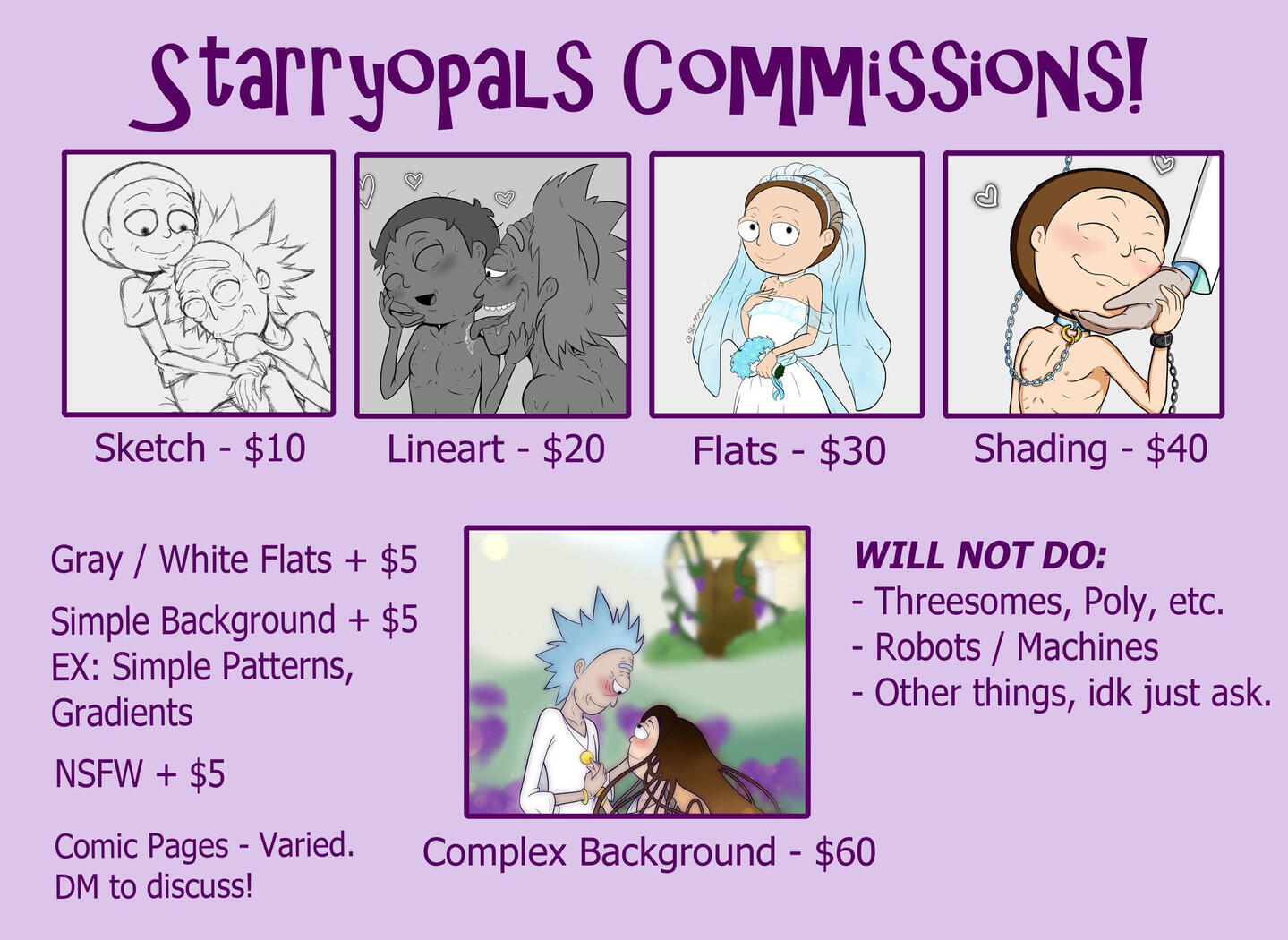 I primarily draw Rick & Morty fanart, but I’m open to drawing from other fandoms. I can also do different styles, please check out my Twitter to see.Rickorty, Rickcest, & Mortycest are all OK!